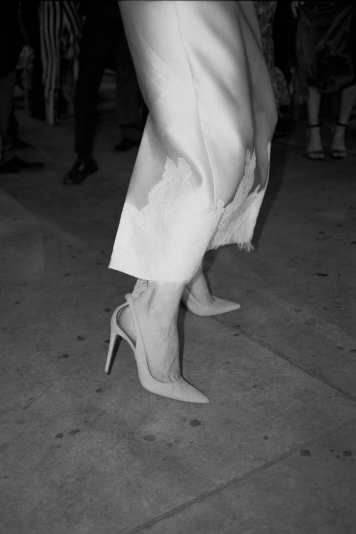 El vestido está realizado en mikado de seda, un tejido con más cuerpo y brillo que nos permitió llevar a cabo el diseño de la falda inspirada en Dior. Volumen y pliegues en la parte superior y un corte recto con abertura detrás.