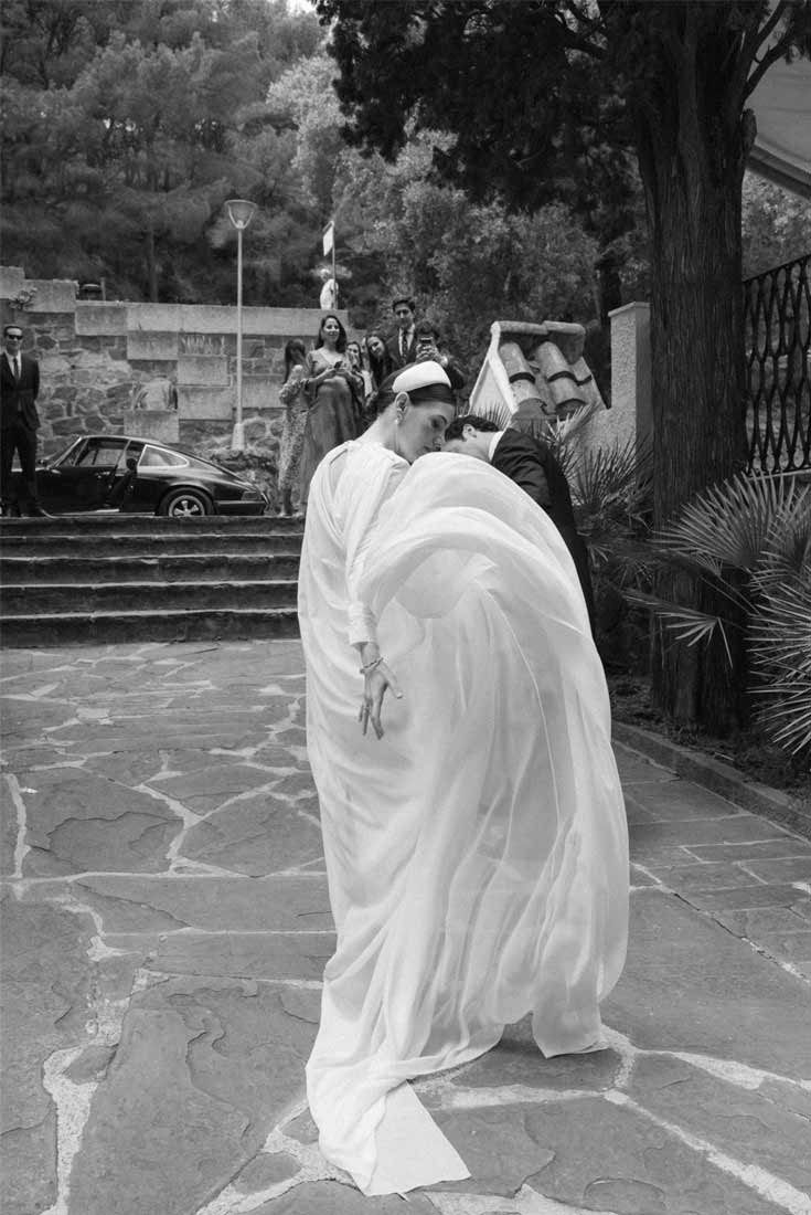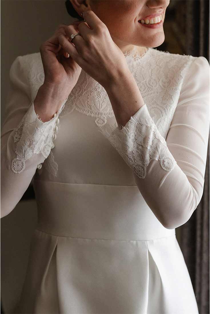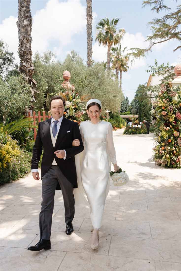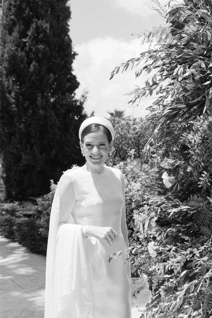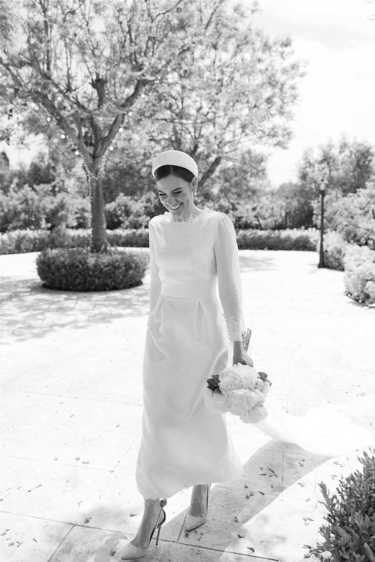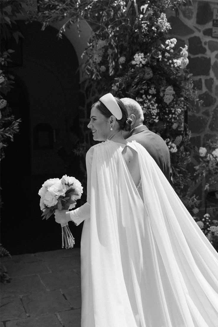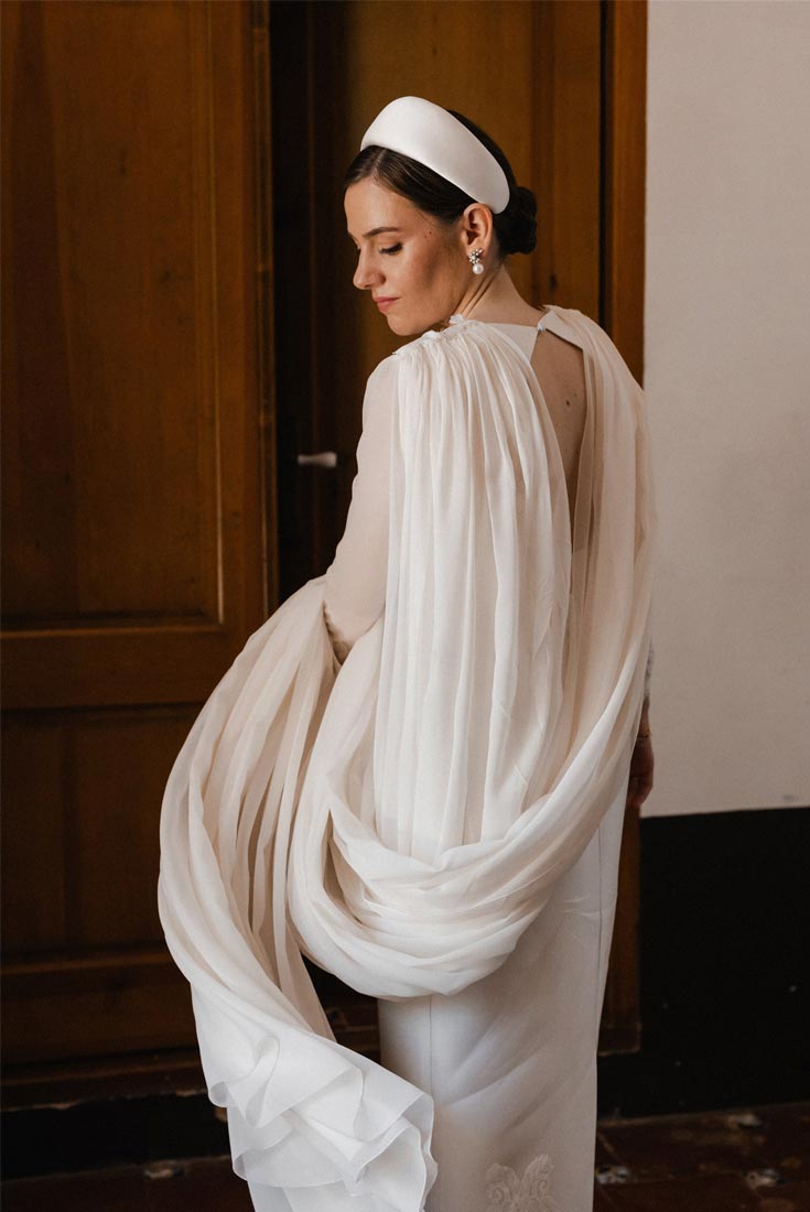 El vestido de novia de Isabel es el ejemplo perfecto del más puro estilo chic parisino. El look completo (el corte del vestido, la espectacular capa, todos los complementos…) es el reflejo de la sofisticación.