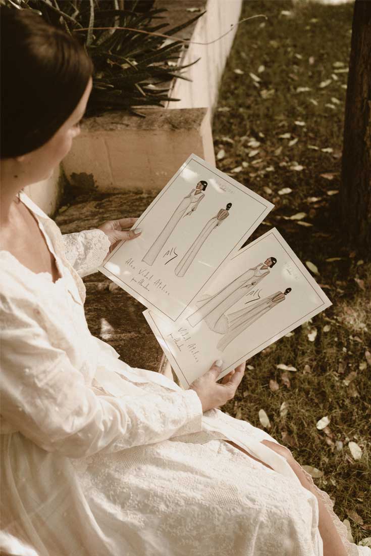 Para la línea del escote en pico diseñamos un drapeado para darle valor al escote. La cintura está adornada con una pieza central ancha donde incrustamos a mano un bordado de hilo con un motivo de flores de almendro que al Almudena le enamoraron desde el primer día. El aire romántico lo aportan las mangas fluidas con el puño terminando a modo evasé, en georgette de seda natural. La delicadeza del tejido nos permitió jugar también con las transparencias y poder llevar así una manga larga incluso en los meses más calurosos.