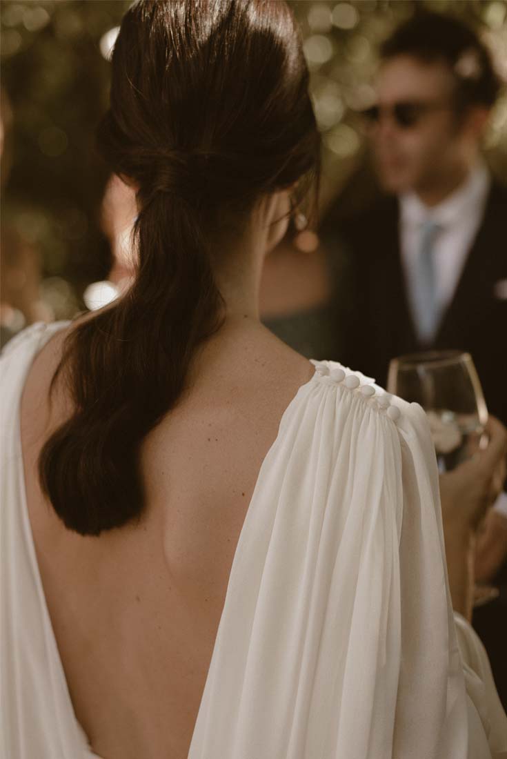 En la espalda, una espectacular abertura que dejaba toda la espalda al descubierto, enmarcada en un drapeado pequeño realizado en georgette de seda y rematado a mano. Además, la capa de Almudena también se diseño con abertura en la espalda para no cubrir el diseño. El movimiento y textura de la capa fue la combinación perfecta para completar el look.
